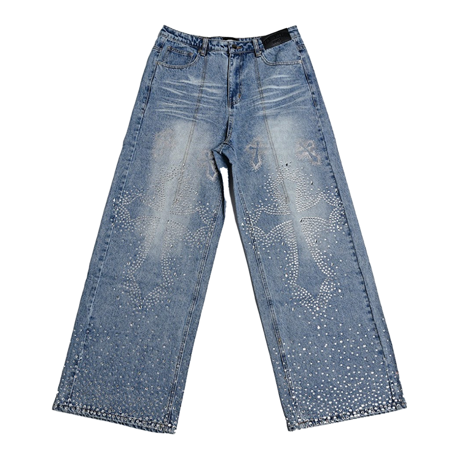 The light blue wash gives off a vintage, sun-faded tone while the wide-leg fit and distressed whiskering deliver that effortless Y2K street aesthetic. Designed to stand out day or night, this piece is a statement essential for anyone repping bold individuality and street-luxe flair.