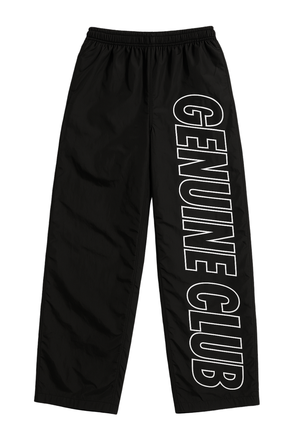 Crafted from high-quality, lightweight nylon, these pants offer a relaxed fit with an effortlessly sleek silhouette. Featuring eye-catching oversized "Genuine Club" branding along the legs, they make a statement wherever you go. The elastic waistband with adjustable drawstrings ensures a customizable fit, while the breathable fabric provides all-day comfort.